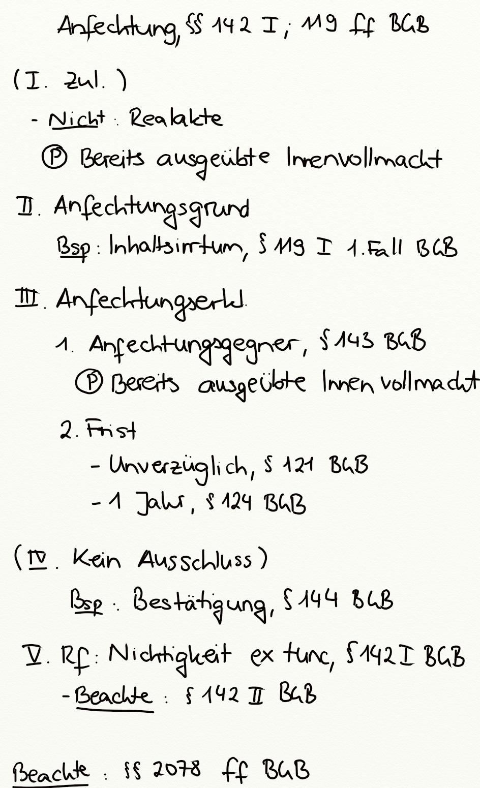 Anfechtungserklärung, ex tunc, Gestaltungsrecht, Anfechtungsgrund, § 119 BGB, Anfechtung, Anfechtungsgegner, Anfechtungsfrist, § 142 I BGB, § 142 II BGB, § 121 BGB, § 124 BGB, bereits ausgeübte Innenvollmacht, Unverzüglich, § 144 BGB, Bestätigung, § 2078 BGB, § 143 BGB, Anfechtung einer bereits ausgeübten Innenvollmacht