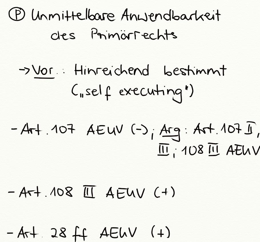 Art. 107 III AEUV, Beihilfen, Art. 107 II AEUV, Grundfreiheiten, Art. 28 AEUV, Unmittelbare Anwendbarkeit des Primärrechts, Art. 108 III AUEV, Bestimmtheit, Art. 107 AEUV, self executing, Art. 108 AEUV, Primärrecht