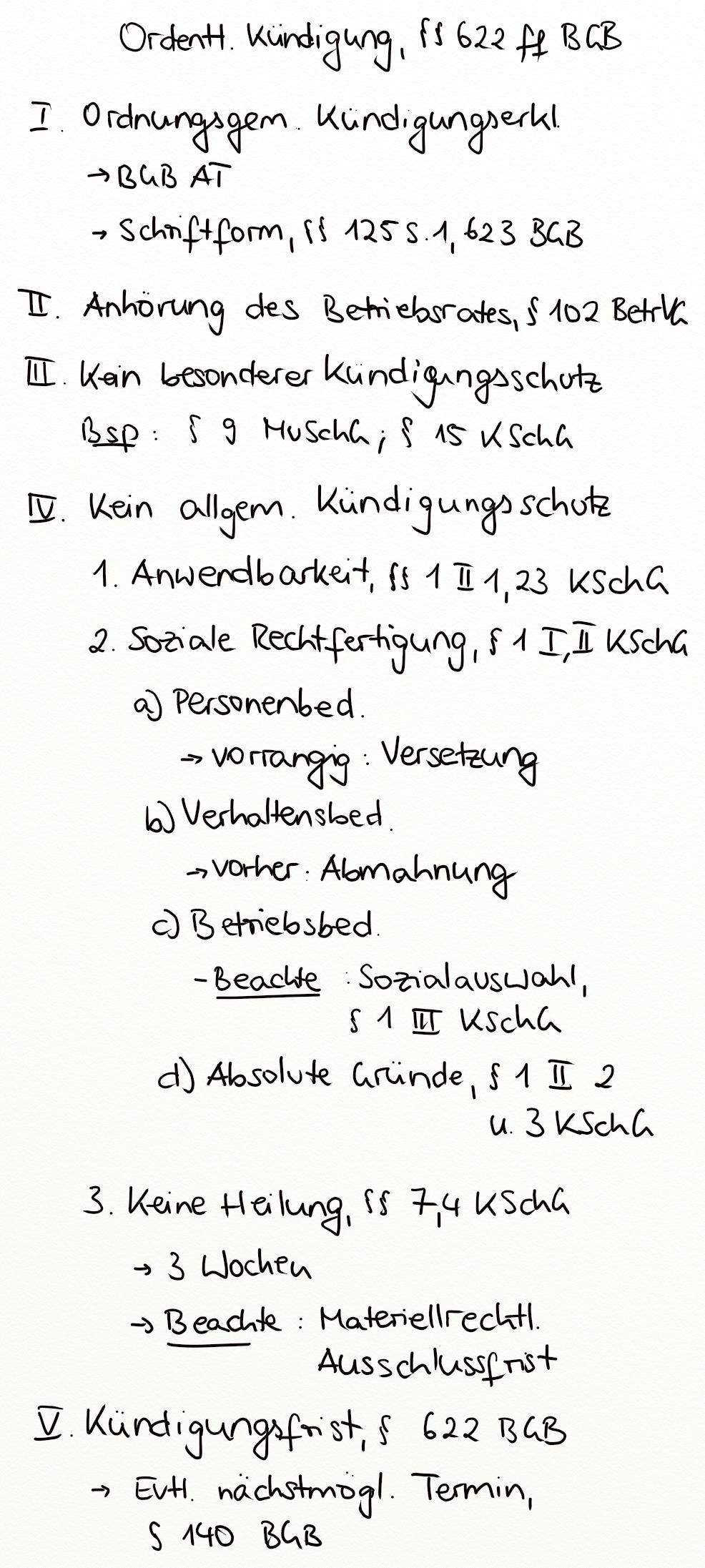 § 125 BGB, Betriebsrat, § 623 BGB, Besonderer Kündigungsschutz, § 102 BetrVG, Schriftform, § 622 BGB, Ordentliche Kündigung, Umdeutung, Betriebsratstätigkeit, § 140 BGB, Kündigungsfrist, Kündigungsschutzklage, § 4 KSchG, § 7 KSchG, § 1 II 3 KSchG, § 1 III KSchG, § 1 II 2 KSchG, Betriebsbedingte Kündigung, Sozialauswahl, § 125 S. 1 BGB, Verhaltensbedingte Kündigung, Abmahnung, § 1 II KSchG, Personenbedingte Kündigung, § 23 KSchG, § 1 I KSchG, Kündigung, § 1 KSchG, § 1 II 1 KSchG, § 15 KüSchG, Soziale Rechtfertigung, Kündigungsschutz, § 9 MuSchG