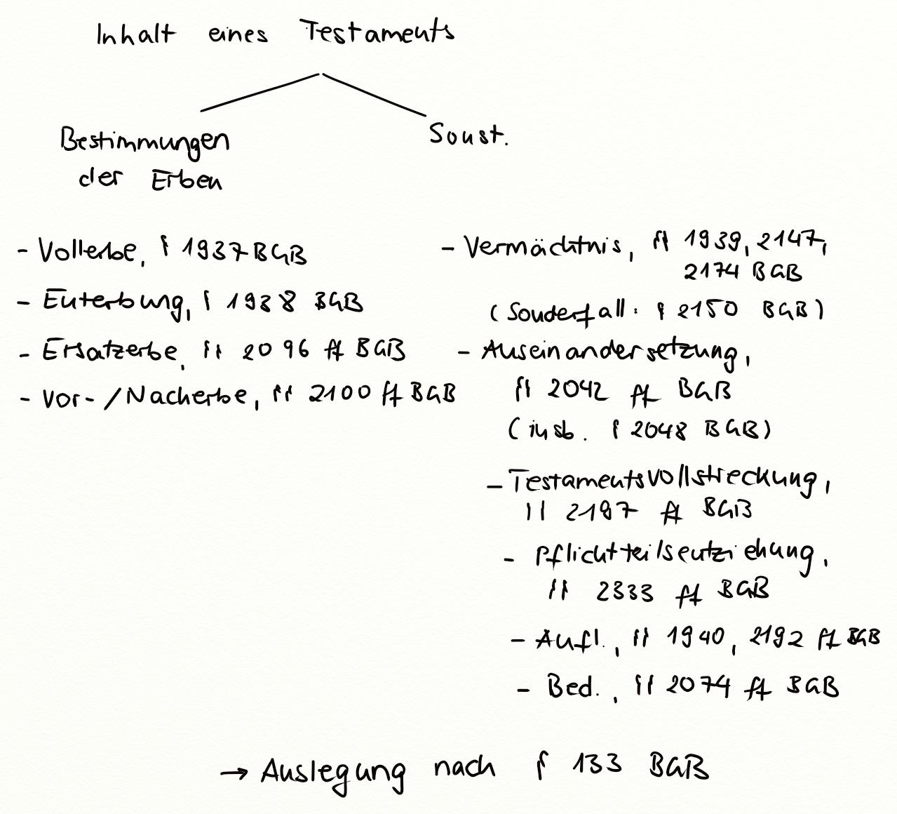§ 133 BGB, Bedingung, Auflage, Testament, Enterbung, § 1937 BGB, § 1938 BGB, § 2096 BGB, Ersatzerbe, Vollerbe, Erbe, Vermächtnis, Nacherbe, § 2100 BGB, Vorerbe, § 2150 BGB, § 2174 BGB, § 2147 BGB, § 1939 BGB, § 2042 BGB, Teilungsanordnung, Vorausvermächtnis, Auseinandersetzung einer Erbengemeinschaft, § 2197 BGB, Pflichtteilsentziehung, § 20 48 BGB, Testamentsvollstreckung, § 2192 BGB, § 2074 BGB, § 2333 BGB, § 1940 BGB