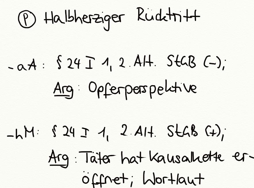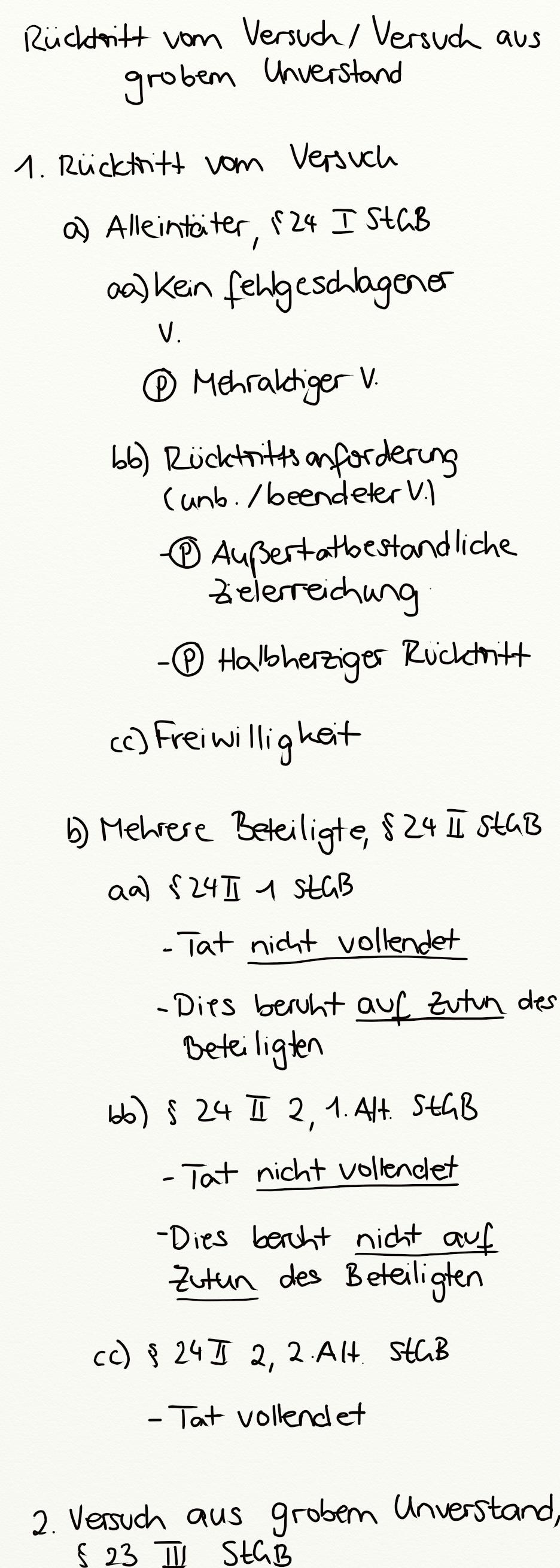grober Unverstand, Versuch, § 24 StGB, Rücktritt vom Versuch, § 23 III StGB, § 24 I StGB, Halbherziger Rücktritt, Mehraktiger Versuch, Fehlgeschlagener Versuch, Freiwilligkeit, § 24 II 2 StGB, § 23 StGB, § 24 II 1 StGB, Außertatbestandliche Zielerreichung, Unbeendeter Versuch, Beendeter Versuch, Denkzettel-Fälle