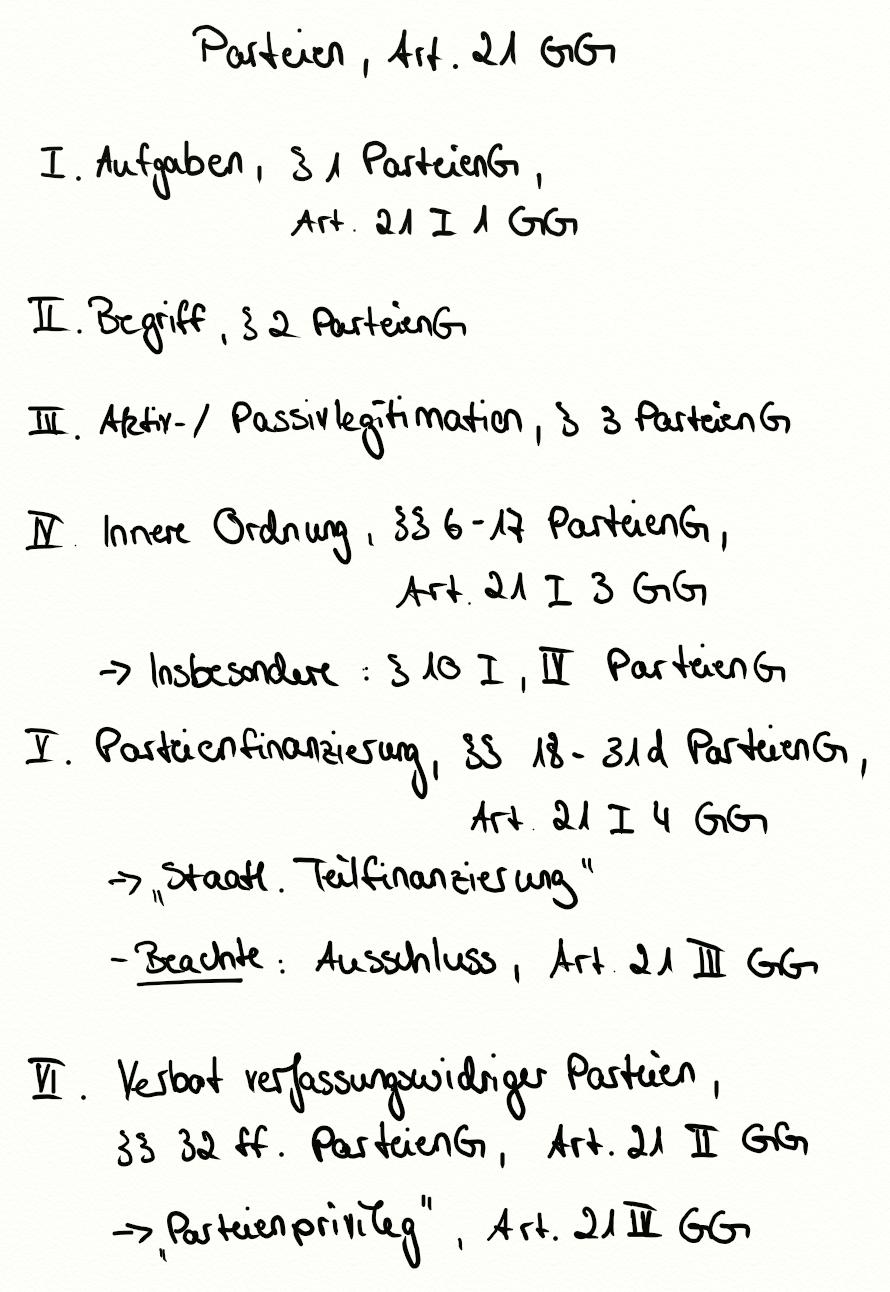 Art. 21 GG, Parteien, Art. 21 I 3 GG, Art. 21 I 1 GG, Parteienprivileg, Parteinfinanzierung, § 3 ParteienG, § 10 ParteienG, § 2 ParteienG, § 1 ParteienG, Art. 21 II 1 GG, Art. 21 I 4 GG, Art. 21 III GG, Art. 21 II GG, Art. 21 IV GG