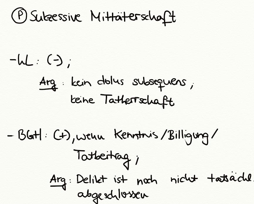 Sukzessive Mittäterschaft bedeutet wörtlich übersetzt eine "Stück für Stück" Mittäterschaft und liegt immer dann vor, wenn im übertragenen Sinne einer der beiden Täter bereits ein Stück des Weges gegangen ist und der andere später dazu stößt.